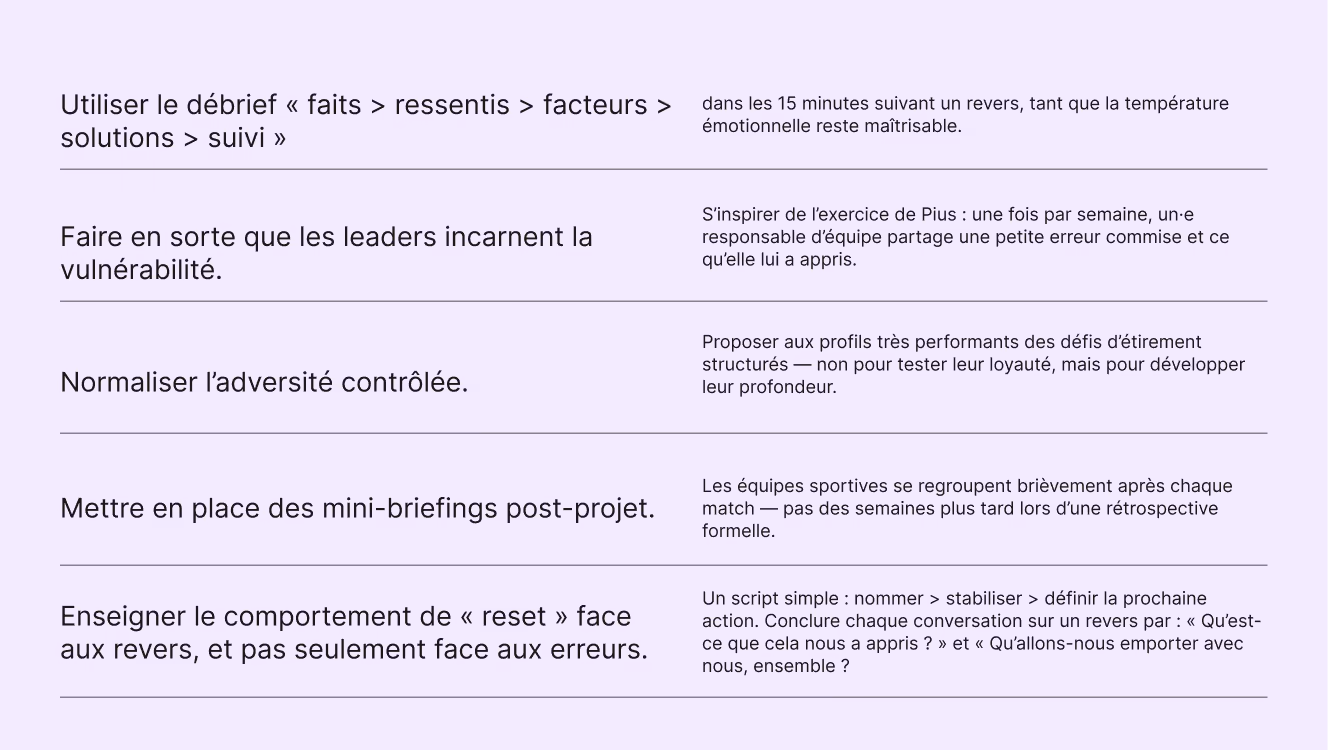 - Adoption par les managers des playbooks de reset et de débrief d’échec : taux d’adoption des playbooks (comme lorsque les coachs incarnent la vulnérabilité en partageant leur propre « erreur de la semaine »).